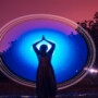 Female silhouette in glowing circle in nature